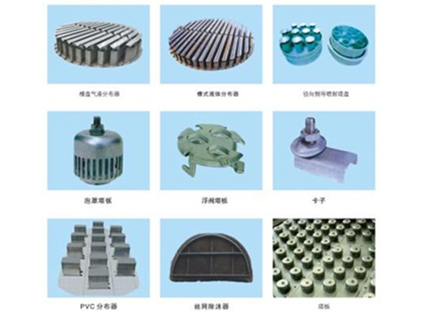 主要包括液體分布器、填料緊固裝置、填料支撐、液體再分布器及進(jìn)出料裝置、氣體進(jìn)料及分布裝置及除沫器等。其作用除支撐填料之外,主要目的是使氣液在塔內(nèi)接觸,充分發(fā)揮填料的優(yōu)勢(shì)。塔內(nèi)件和填料及塔體共同構(gòu)成了一個(gè)完整的填料塔,塔內(nèi)件是填料塔的組成部分。塔內(nèi)件設(shè)計(jì)的好壞直接影響到整個(gè)填料塔的操作運(yùn)行和填料性能的發(fā)揮。此外,填料塔的“放大效應(yīng)”除了填料本身固有的因素之外,塔內(nèi)件對(duì)它的影響也很大。